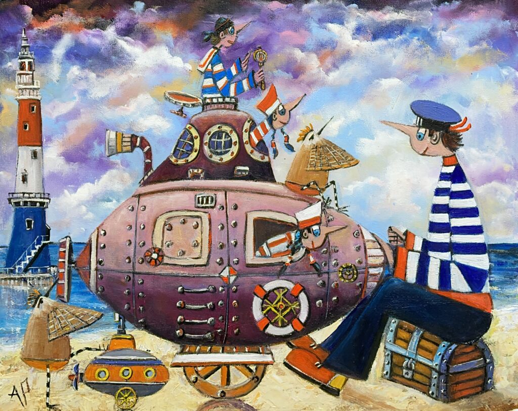 Hundreds of paintings and sculptures are in collections all over the world, including USA, New Zealand and even Afghanistan also in all European countries. Currently inspired by ceramic art in a funny way trying to tell about human passions. Behind the fairy-tale decorations are hidden the deepest human passions and desires. Canvas stretched on wooden frame. Colors of the painting may slightly differ from photos due to screen settings.
