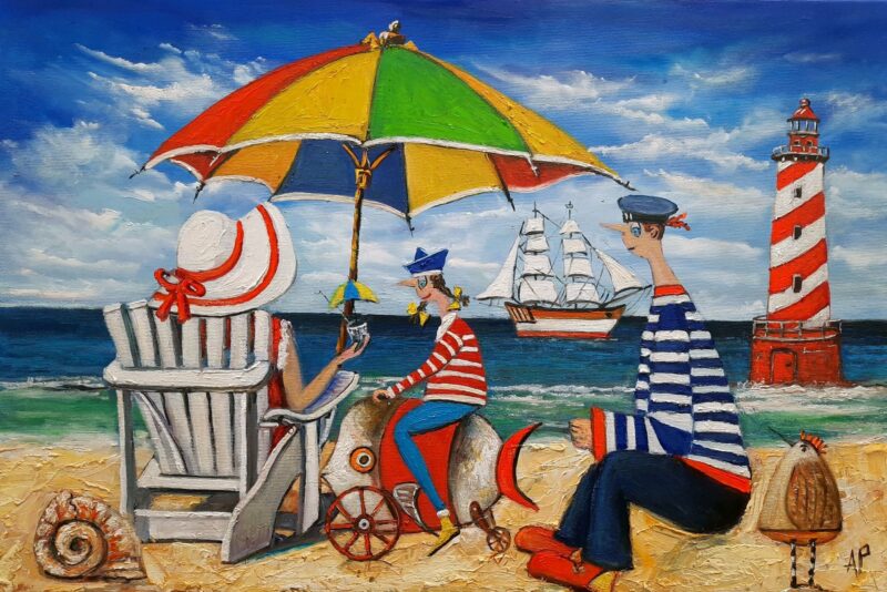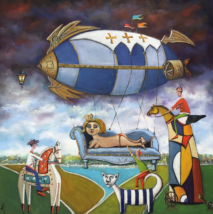 Hundreds of paintings and sculptures are in collections all over the world, including USA, New Zealand and even Afghanistan also in all European countries. Currently inspired by ceramic art in a funny way trying to tell about human passions. Behind the fairy-tale decorations are hidden the deepest human passions and desires. Canvas stretched on wooden frame. Colors of the painting may slightly differ from photos due to screen settings.