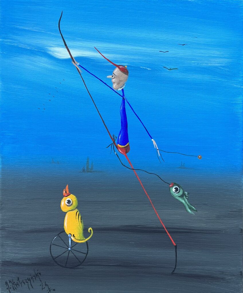 In a breathtaking dance of surrealism and whimsy, this intriguing canvas invites the viewer into a luminous dreamscape, where imagination takes the reins. Against a backdrop of ethereal blue skies, a delicate figure strides on impossibly elongated red stilts, defying gravity with a nonchalant grace. The boldness of the yellow bird on a unicycle—its feathered crown a nod to playful absurdity—adds a delightful counterpoint to the composition. Note the curious accompaniment of the green fish tethered by a thin line, as if offering a serenade to this surreal parade. The artwork's palette, dominated by azure and accented with vivid primary hues, enhances its dreamlike quality, evoking a sense of childlike wonder tinged with a hint of philosophical musing. Echoes of Dalí softly murmur in the distance, yet the piece holds its own distinct charm, inviting a smile and a moment of contemplation.