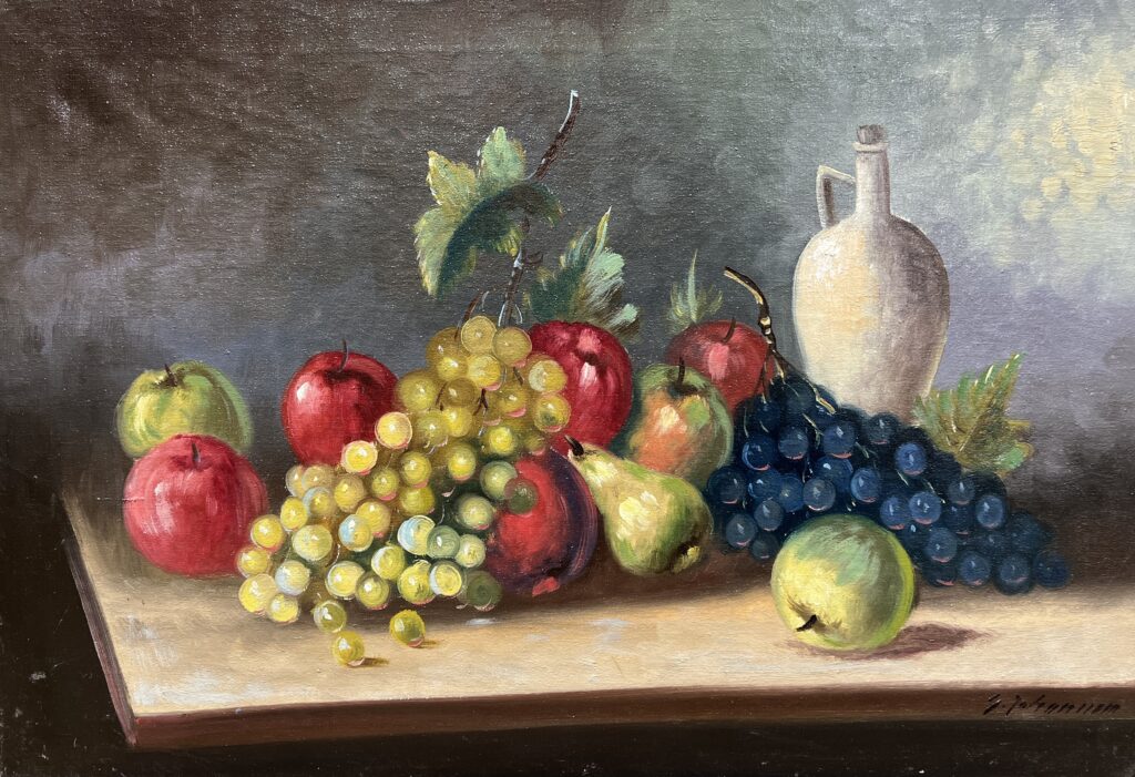 In this delightful still life, the artist conjures a veritable symphony of color and form, reminiscent of the classic masters of the genre. The table, a stage, hosts a bountiful ensemble of fruits—each item rendered with meticulous precision. Lush apples and glistening grapes luxuriate in their rich, jewel-like tones, while the humble pear adds a soft contrast with its verdant hue. The white jug, serene and unaffected, completes the composition with an air of classical elegance.