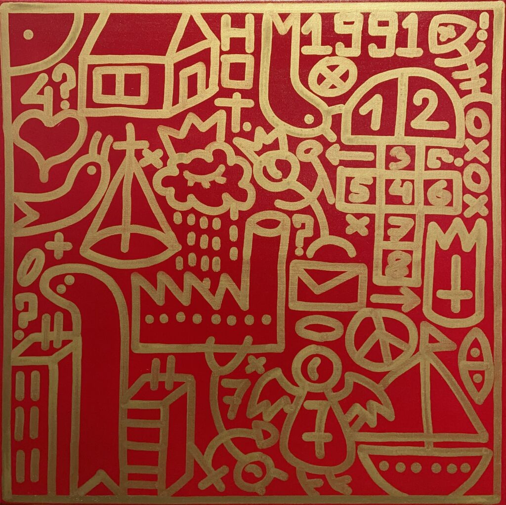 A vibrant tapestry of iconography unfolds before us, reminiscent of the playful yet poignant language of street art. This piece, echoing the energetic essence of Keith Haring, dances with symbols rendered in a bold golden hue that gleams against a rich red background. The composition, deceptively simple yet intriguingly complex, weaves together whimsical motifsβa serene angel, a resolute peace sign, and cryptic numeralsβeach a fragment of a larger, mysterious narrative. The juxtaposition of joyful imagery with hints of existential pondering invites the viewer to explore its layered meanings. This artwork gleefully challenges the boundary between high art and popular culture, making it a conversation starter for any discerning collector's display.