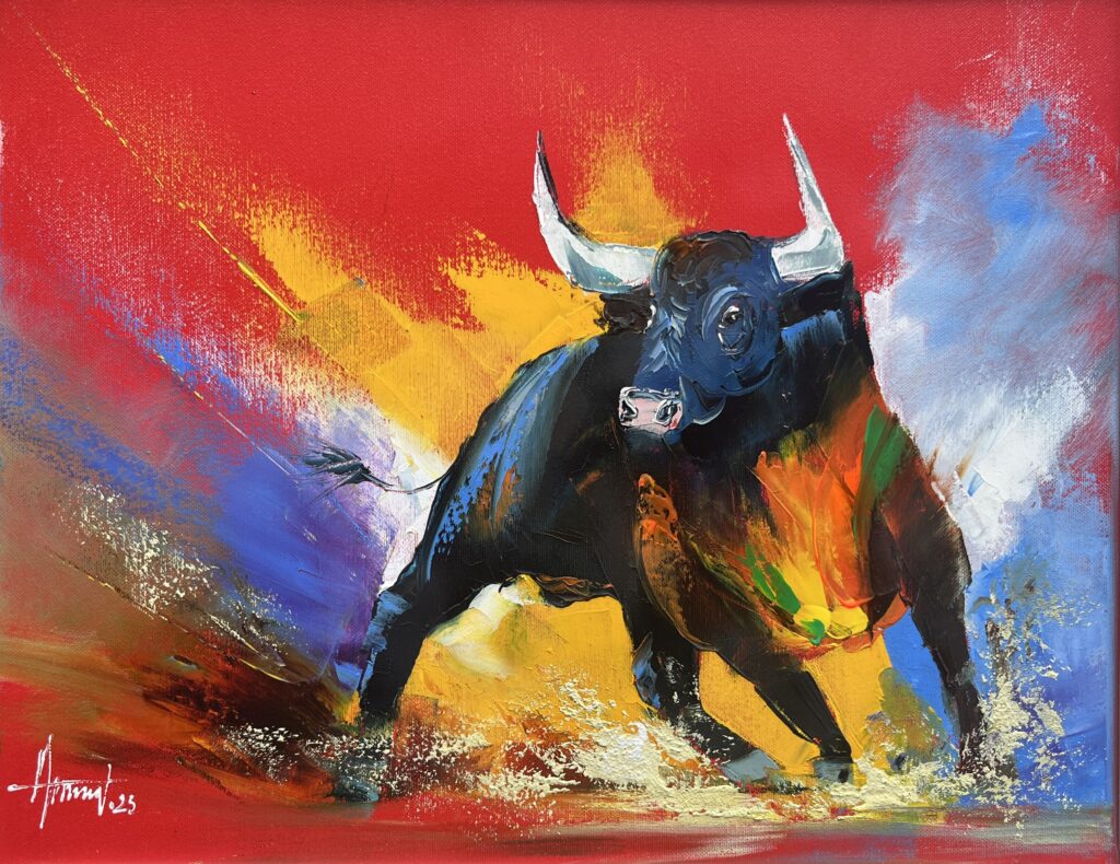 In a whirlwind of vibrant energy and audacious color, this dynamic canvas captures a moment of sheer, unbridled power. The protagonist, a formidable bull, charges forth with a grace that belies its raw strength, its horned silhouette stark against the flamboyant backdrop. The artist engages with an intoxicating cocktail of primary huesβreds that burn with passion, yellows that radiate intensity, and blues that cool the frenzyβinfusing the scene with palpable tension and movement.