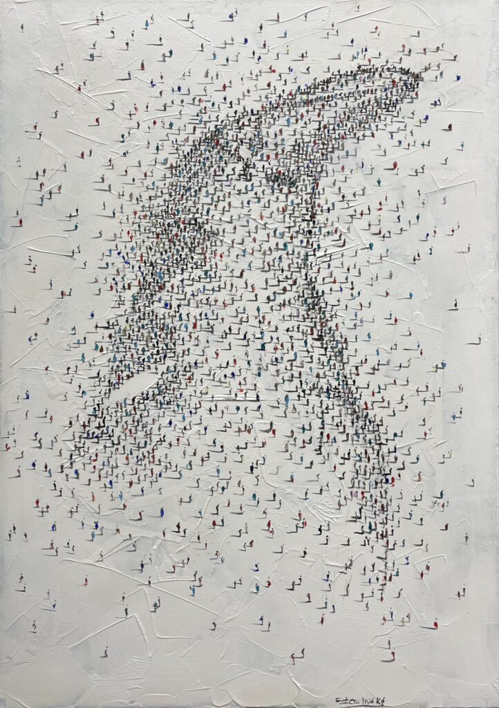 In a mesmerizing dance of abstraction and figuration, this artwork elegantly crafts a human tapestry against an ethereal white backdrop. The myriad of tiny, colorful figures coalesce to form the shape of a wolfβits majestic silhouette conjured from an assemblage of joyous human specks. The artistβs deft use of contrast accentuates the vibrant interplay of individual elements, while subtle shadows imbue depth and dimension. Each figure contributes a splash of color, reminiscent of pointillist techniques with a contemporary twist, evoking hints of Seuratβs meticulous whimsy. The piece embodies a delightful paradox, where chaos meets order, beautifully capturing the essence of unity and collective identity in a singular, elegant form.