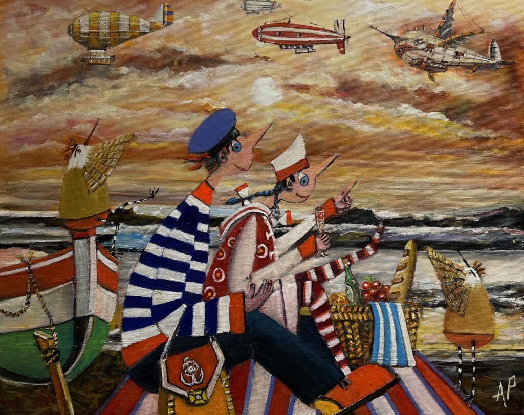 Hundreds of paintings and sculptures are in collections all over the world, including USA, New Zealand and even Afghanistan also in all European countries. Currently inspired by ceramic art in a funny way trying to tell about human passions. Behind the fairy-tale decorations are hidden the deepest human passions and desires. Canvas stretched on wooden frame. Colors of the painting may slightly differ from photos due to screen settings.