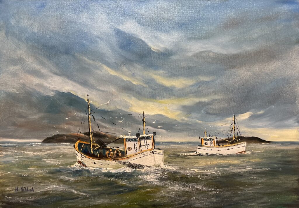This evocative maritime painting captures the resilience and beauty of life at sea. Two steadfast fishing boats navigate the rolling waves, their weathered hulls reflecting years of hard work and adventure. The dramatic sky, with swirling clouds and shifting light, sets a powerful moodβone of perseverance, anticipation, and the call of home.