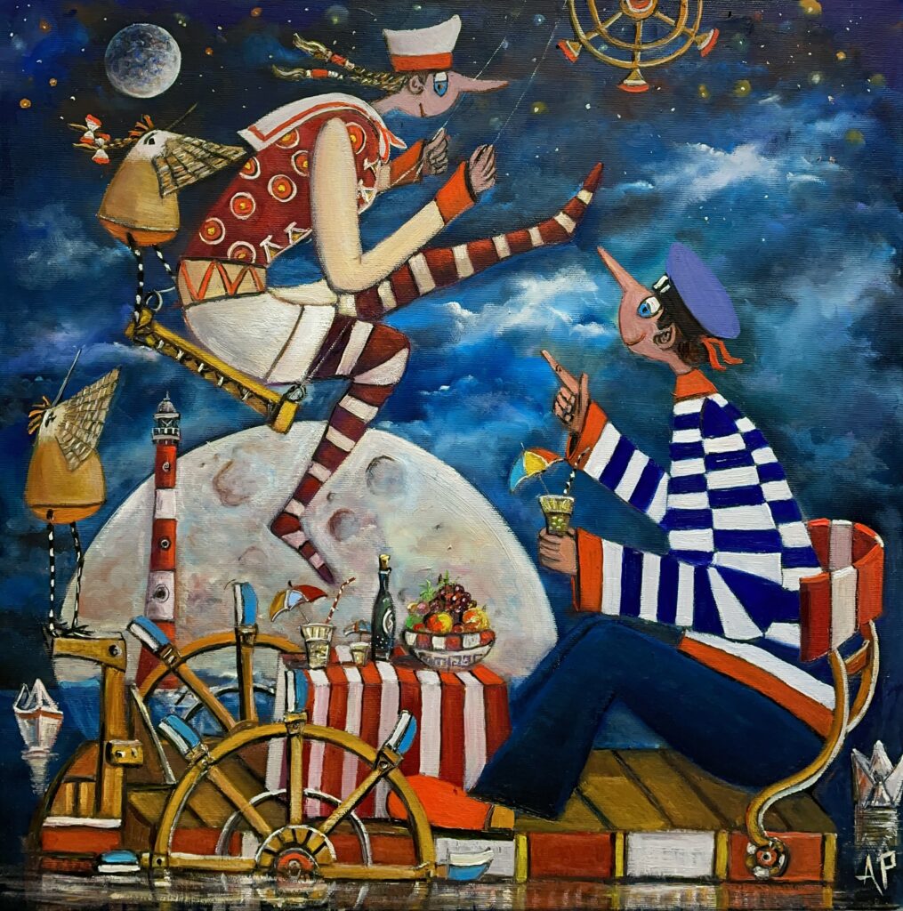 Hundreds of paintings and sculptures are in collections all over the world, including USA, New Zealand and even Afghanistan also in all European countries. Currently inspired by ceramic art in a funny way trying to tell about human passions. Behind the fairy-tale decorations are hidden the deepest human passions and desires. Canvas stretched on wooden frame. Colors of the painting may slightly differ from photos due to screen settings.