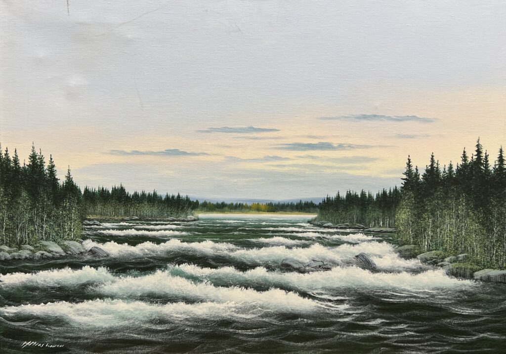 Beneath a vast expanse of serene sky, the artist captures the tumultuous embrace of a river as it advances with spirited fervor. The composition deftly balances the vibrant energy of the frothy rapids with the tranquil embrace of towering pines, whose muted greens mirror the gentle dawn's glow. The meticulous brushwork lends an almost tactile realism to the scene, evoking memories of the Hudson River School's reverence for nature's power. A sense of depth unfolds with the receding forests, leading the viewer's gaze towards a horizon bathed in soft pastels. This piece is a harmonious dance of light and water, encapsulating a moment of invigorating solitude amidst the wild's eternal rhythm.