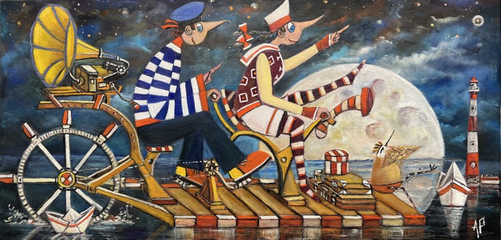 Hundreds of paintings and sculptures are in collections all over the world, including USA, New Zealand and even Afghanistan also in all European countries. Currently inspired by ceramic art in a funny way trying to tell about human passions. Behind the fairy-tale decorations are hidden the deepest human passions and desires. Canvas stretched on wooden frame. Colors of the painting may slightly differ from photos due to screen settings.