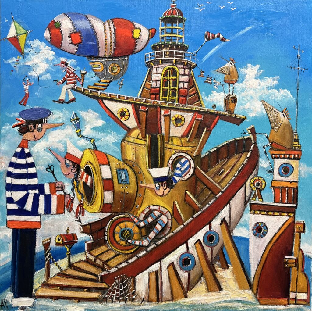 In this whimsical canvas, one finds a delightful juxtaposition of maritime adventure and fanciful imagination. The painting is a vivid symphony of primary colors, where sky blue contrasts with bold reds and vibrant yellows, invoking a childlike wonder reminiscent of a dreamscape. The composition hearkens to the playfulness of surrealism, with its topsy-turvy ship and eccentric crew, each sailor brimming with mischief. The meticulous brushwork creates intricate textures, accentuating both the absurd and the delightful. There's an undeniable influence of the cartoonish and the absurdist, suggesting a nod to the dada movement. This piece invites the spectator to abandon reason and embark on a fantastical voyage, where the sea is as vast as the imagination.