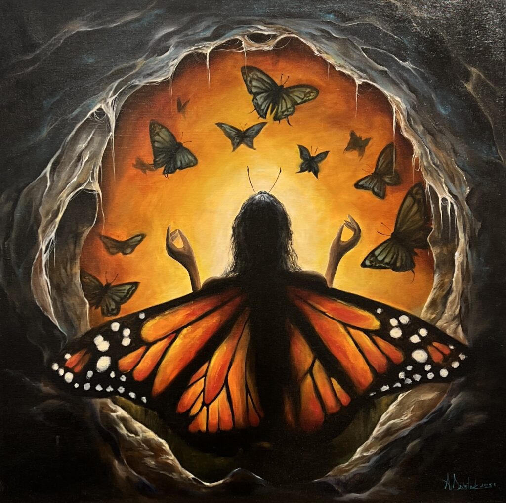 In an enchanting dance between realism and surrealism, this mesmerizing tableau captures a mystical figure at the heart of a luminous chrysalis. The metamorphosis echoes through the striking orange hues of butterfly wings, set aflame against a shadowy cavern. The delicate chiaroscuro invites the eye to explore contrasts of light and darkness, echoing themes of transformation and rebirth.