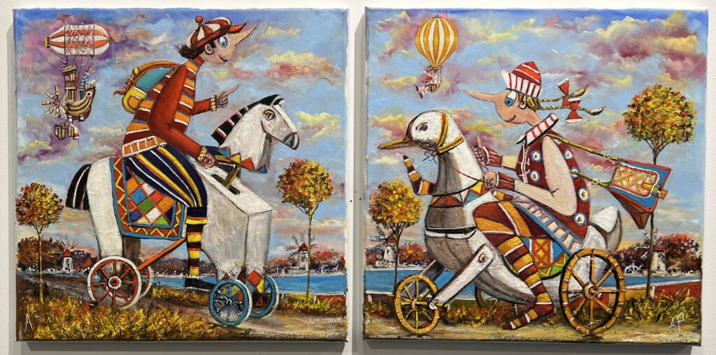 In this whimsical diptych, a vibrant tableau unfolds, echoing the eccentric charm of a surreal carnival parade. The artist employs a bold, playful palette that dances between vivid oranges, deep blues, and warm earth tones, infusing the scene with a buoyant energy. Each panel features a fantastical rider, astride peculiar, toy-like steeds that evoke childhood nostalgia while nodding subtly to the avant-garde geometry of Cubism. The subtle juxtaposition of modern-day whimsy and timeless narrative creates a delightful paradox, inviting viewers into a world teetering on the edge of fantasy and reality. The sky, adorned with cotton-candy clouds and imaginative airships, seems almost to swirl around the characters, adding depth and dynamism to the composition. The overall effect is a jubilant celebration of imagination, reminiscent of Chagall’s dreamlike worlds, where art becomes a joyful journey through time and space.