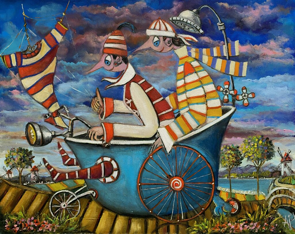 Hundreds of paintings and sculptures are in collections all over the world, including USA, New Zealand and even Afghanistan also in all European countries. Currently inspired by ceramic art in a funny way trying to tell about human passions. Behind the fairy-tale decorations are hidden the deepest human passions and desires. Canvas stretched on wooden frame. Colors of the painting may slightly differ from photos due to screen settings.