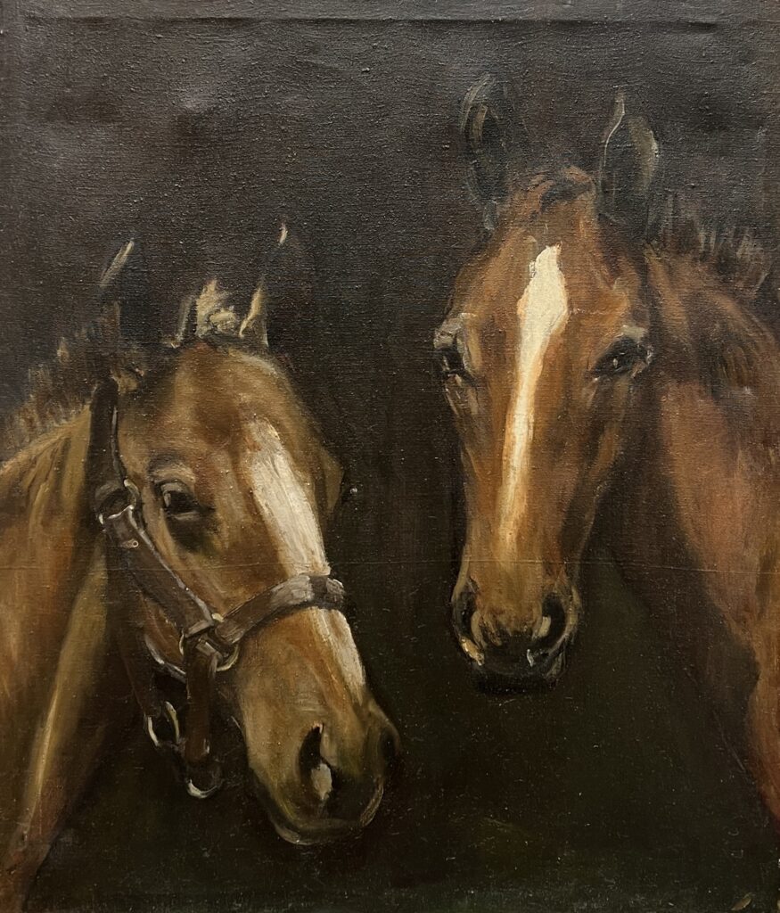 Two young horses emerge from the dusky shadows, their soft brown coats and white blazes captured with gentle brushwork and warm highlights. The intimate close-up emphasizes their trusting gaze and quiet bond, set against a subdued, almost velvety background that lends the composition a sense of calm introspection. Through restrained detail and atmospheric tonality, the painting celebrates the subtle grace and silent camaraderie of these noble creatures.