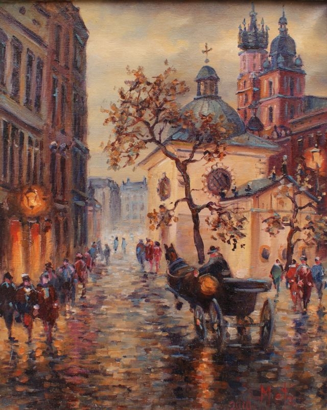 Leszek Metz maluje architekture Krakowa i sceny rodzajowe oraz postacie kobiet.
