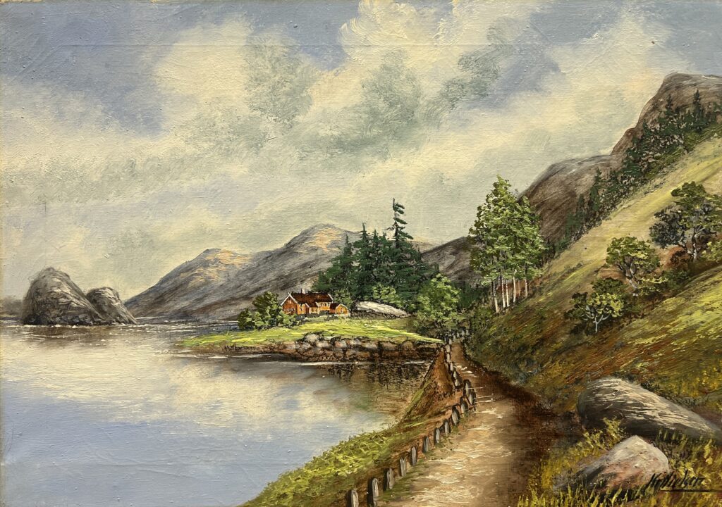 This tranquil landscape painting invites the viewer into a serene lakeside setting, where a winding path leads toward a secluded house nestled among lush greenery. The composition balances natural elements, water, mountains, and sky with human presence, emphasizing harmony between civilization and nature.