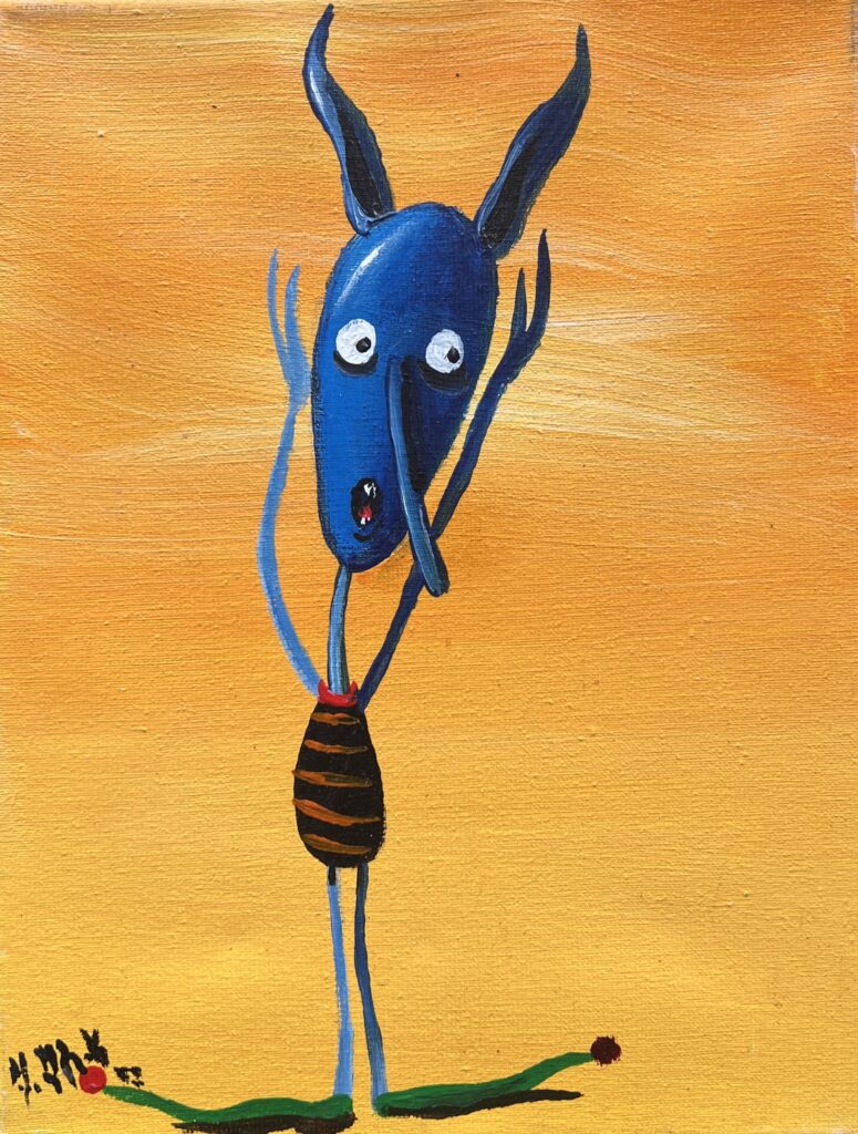 Emerging with an undeniably whimsical charm, this vibrant piece dances between the surreal and the playful, capturing the viewer's imagination with childlike wonder. The canvas is dominated by a striking cobalt figure, its elongated form and exaggerated ears resembling a creature fresh from a dream or perhaps a gentle hallucination. Against a warm, sunlit background, the creature stands bewildered, its eyes wide with a delightful mix of surprise and curiosity.