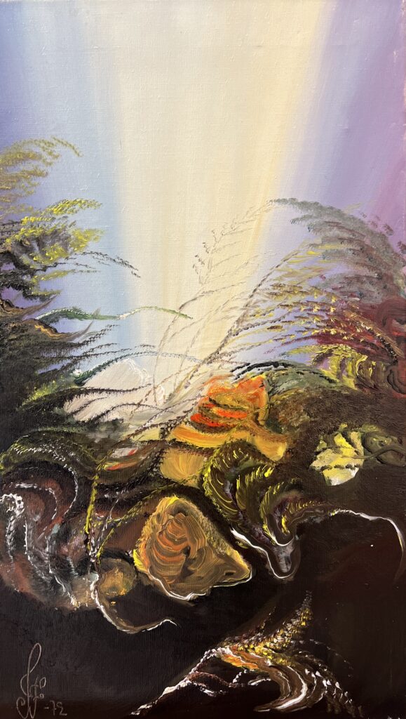 This striking abstract composition, dated 1972, presents a dynamic interplay of light and organic forms, creating a vision that is both ethereal and grounded. The painting is dominated by a radiant beam of light emerging from the upper portion of the canvas, softly transitioning through shades of cream, lavender, and pale blue. This luminous gradient contrasts dramatically with the darker, textured forms in the foreground.