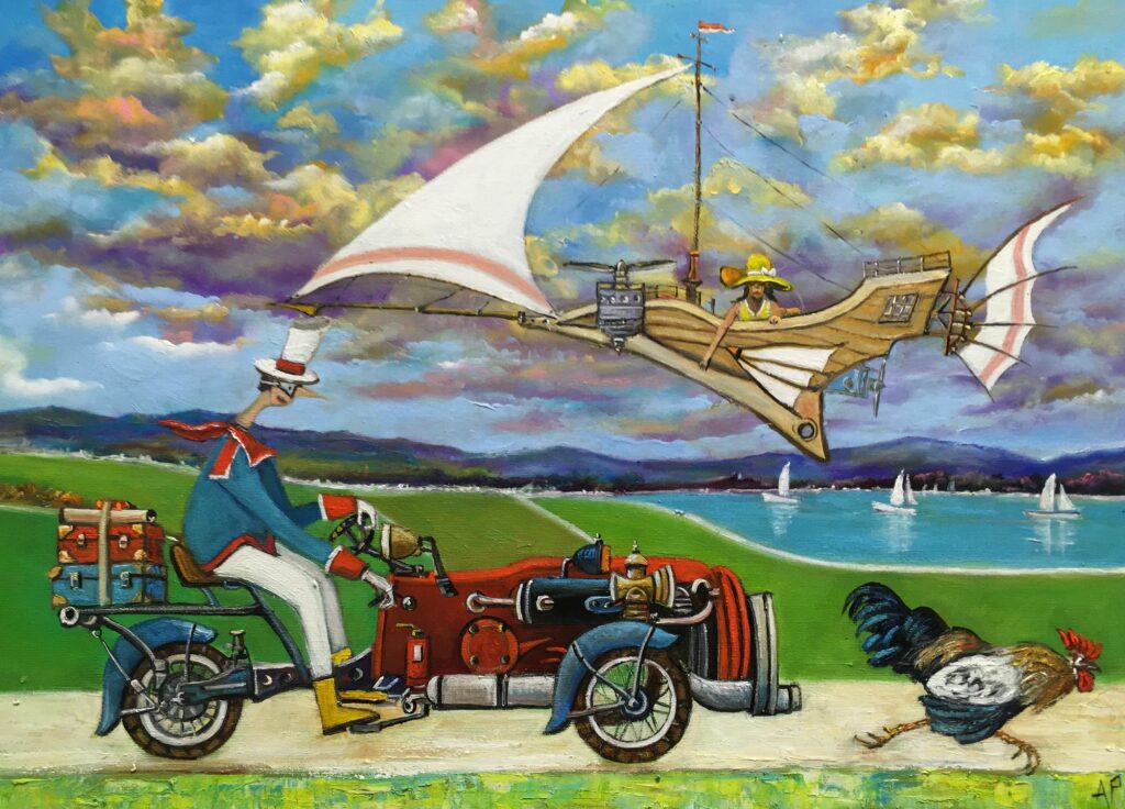 Hundreds of paintings and sculptures are in collections all over the world, including USA, New Zealand and even Afghanistan also in all European countries. Currently inspired by ceramic art in a funny way trying to tell about human passions. Behind the fairy-tale decorations are hidden the deepest human passions and desires. Canvas stretched on wooden frame. Colors of the painting may slightly differ from photos due to screen settings.