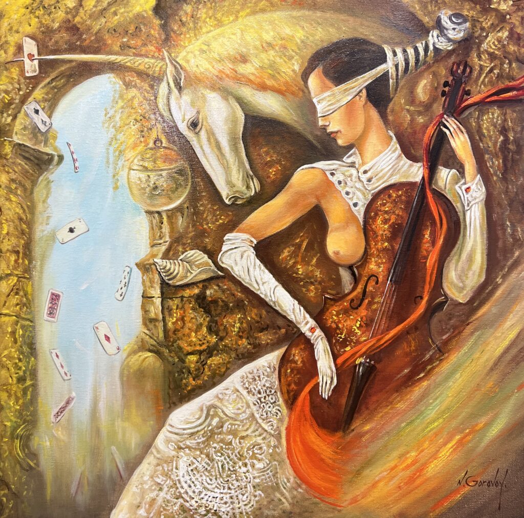 In an intriguing dance of surreal elegance, this painting transports us into a whimsical realm where reality meets dream. A blindfolded muse, poised with a cello, embodies a harmony of mystery and music, while her alabaster skin contrasts the rich, earthy tones enveloping her. Beside her, a unicorn emerges as a guardian of this fantastical world, adding a dash of mythic charm. The cascade of playing cards flutters beyond the archway, evoking the capricious nature of fate. With a palette that waltzes between warm golds and soft pastels, the artist teases the boundaries of realism and fantasy, creating an enigmatic tableau that resonates with echoes of both classical and surrealist influences.