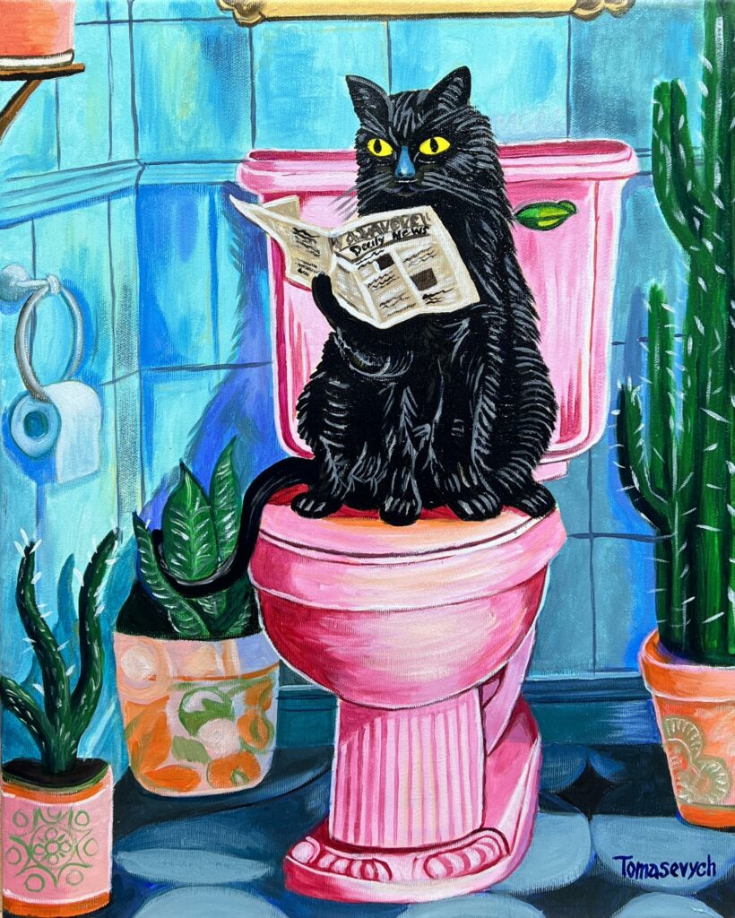 In this whimsical tableau, an enigmatic feline perches regally atop a pink porcelain throne, its fur as dark as midnight and eyes ablaze with a mischievous glint. The artist conjures a playfully surreal world where absurdity meets elegance. The vibrant blues and pinks of the tiled background breathe life into the quietude of the setting, skillfully balancing harmony and contrast. A carefully tended garden of houseplants frames the scene, adding layers of depth and texture. The newspaper, held with improbable dexterity, suggests the cat's engagement in worldly affairs, evoking chuckles and reflections on daily rituals. With echoes of pop art and surrealism, this piece marries humor with the mundane, creating a vivid tableau that captivates and delights the viewer.