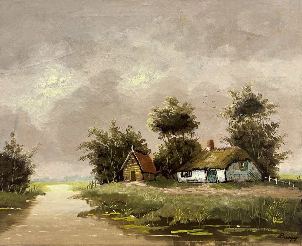 A humble thatched cottage and timber barn stand sheltered by a cluster of trees on the edge of a misty river, their reflections shimmering in the tranquil water. Soft, muted light filters through a brooding sky, lending the scene an air of serene solitude. With its delicate brushwork and harmonious palette of earthy greens and grays, the painting captures the quiet resilience of rural life at the waterβs margin.