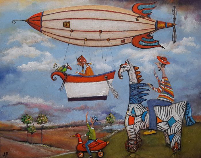 Hundreds of paintings and sculptures are in collections all over the world, including USA, New Zealand and even Afghanistan also in all European countries. Currently inspired by ceramic art in a funny way trying to tell about human passions. Behind the fairy-tale decorations are hidden the deepest human passions and desires. Canvas stretched on wooden frame. Colors of the painting may slightly differ from photos due to screen settings.