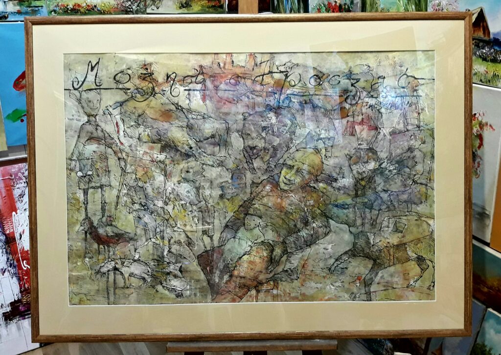 Grafika malowana techniką własną (akryl, tusz, rysunek piórkiem) na kartonie