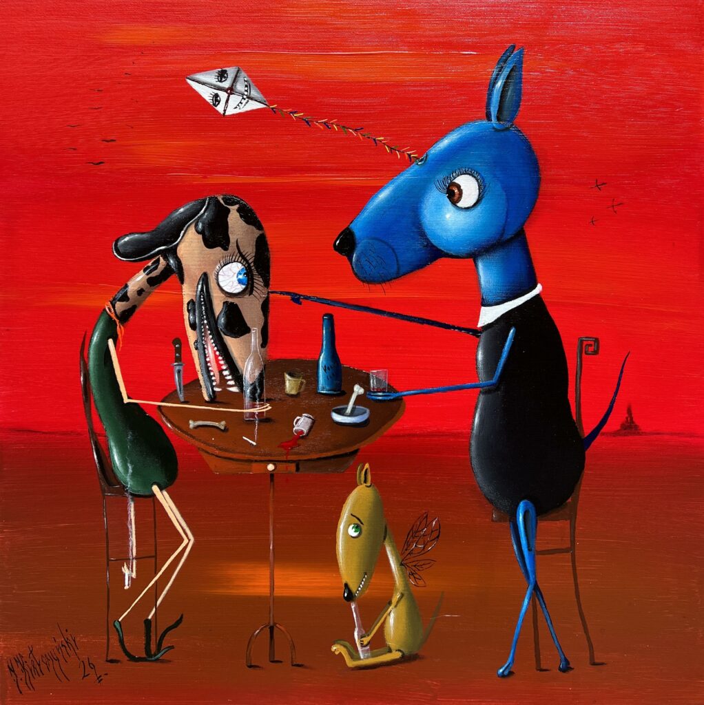 In this whimsical tableau, the artist invites us into a surreal world where the improbable becomes reality. A bold, fiery red backdrop sets the stage, its intensity amplifying the eccentricity of the scene. Seated around a modest table are fantastical figures—a blue creature of lupine elegance in a sharp black attire, engaged in a curious tête-à-tête with its polka-dotted, elongated companion. Their exaggerated features and playful dynamism evoke echoes of surrealism, a tribute perhaps to Dalí's introspective absurdity.
