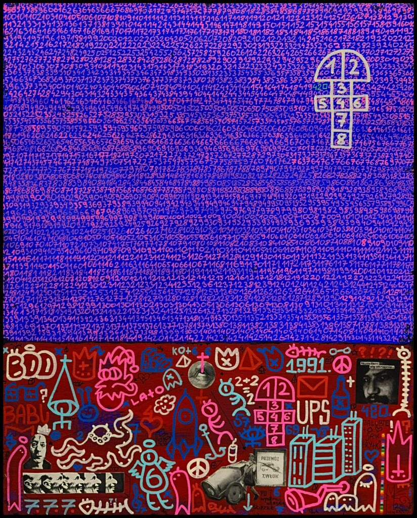 In this riveting composition, the artist masterfully merges the numerical precision of digital code with exuberant bursts of graffiti-like narratives. The upper half presents a hypnotic sea of numbers, a cryptic homage to the infinite labyrinth of data, rendered in a vibrant interplay of cobalt and magenta. Below, a cacophony of symbols, icons, and enigmatic figures erupts in a rebellious cacophony reminiscent of street art’s bold dialogue. This tumultuous blend feels almost Duchampian, a playful nod to Dada's challenge to artistic norms. The juxtaposition forms a striking commentary on the chaos and structure of modern existence, inviting the observer to ponder the dialogue between order and anarchy. Coherent yet chaotic, it’s a visual symphony that defies convention with audacity and wit.
