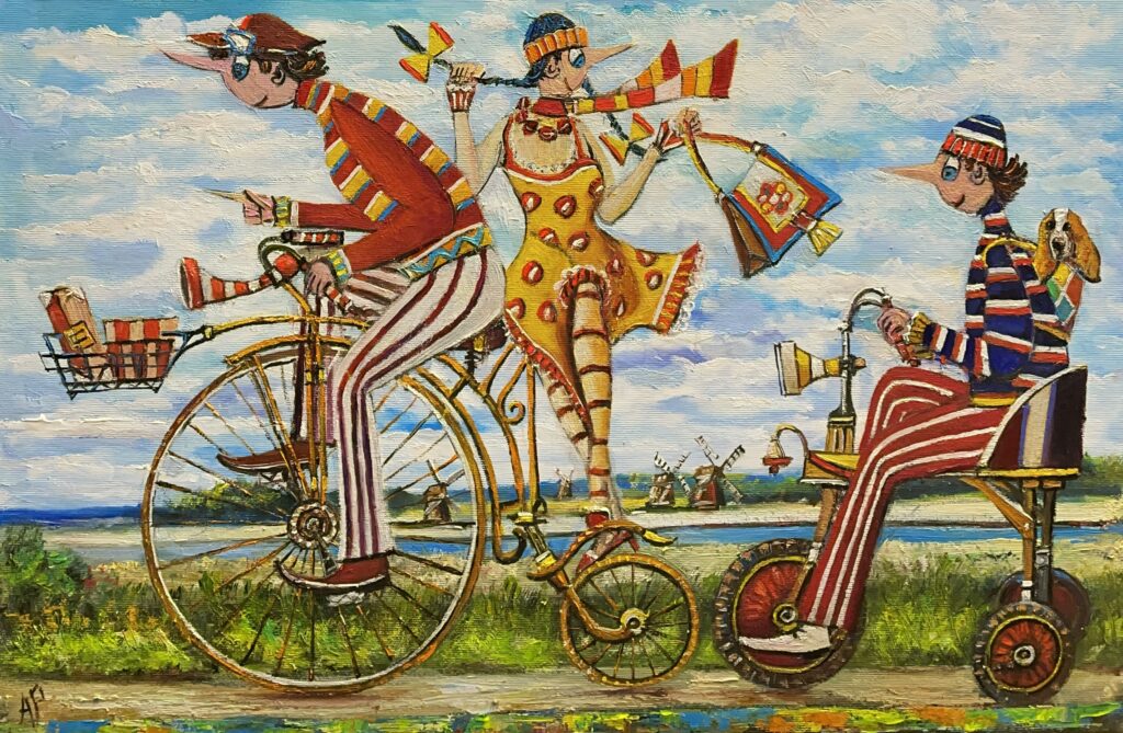 Hundreds of paintings and sculptures are in collections all over the world, including USA, New Zealand and even Afghanistan also in all European countries. Currently inspired by ceramic art in a funny way trying to tell about human passions. Behind the fairy-tale decorations are hidden the deepest human passions and desires. Canvas stretched on wooden frame. Colors of the painting may slightly differ from photos due to screen settings.