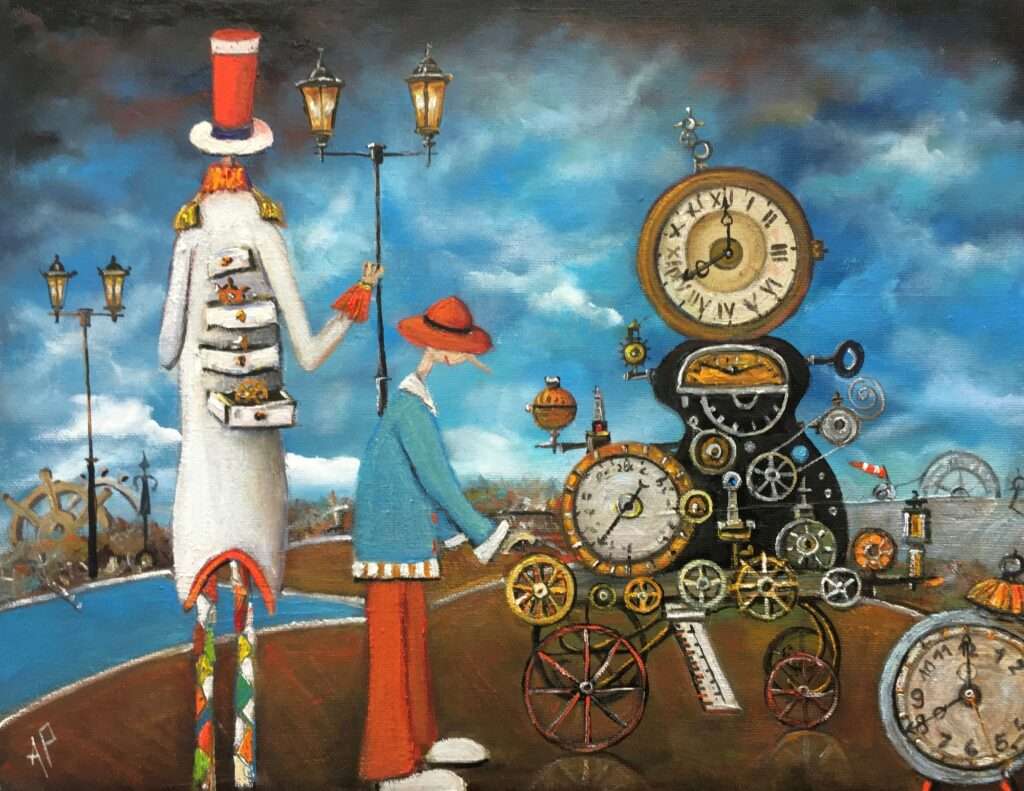 Hundreds of paintings and sculptures are in collections all over the world, including USA, New Zealand and even Afghanistan also in all European countries. Currently inspired by ceramic art in a funny way trying to tell about human passions. Behind the fairy-tale decorations are hidden the deepest human passions and desires. Canvas stretched on wooden frame. Colors of the painting may slightly differ from photos due to screen settings.