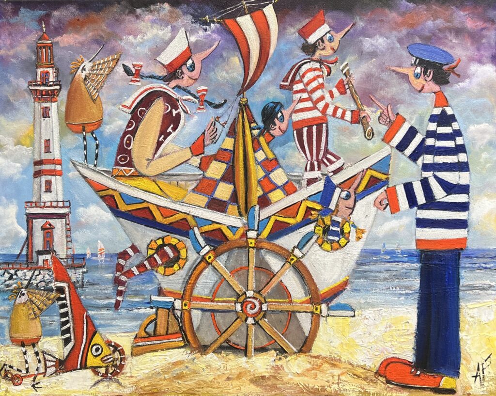In a whimsical dance of color and form, this spirited composition transports us to a world where imagination unfurls its sails at full mast. The artist, with a nod to the playful absurdity of Surrealism, conjures a vibrant tableau that is both nautical and theatrical. The palette bursts with rich primary hues, each brushstroke a flourish of joy and spontaneity. Characters clad in stripes and eccentric hats embark on a surreal voyage, their gestures animated with jubilant camaraderie.