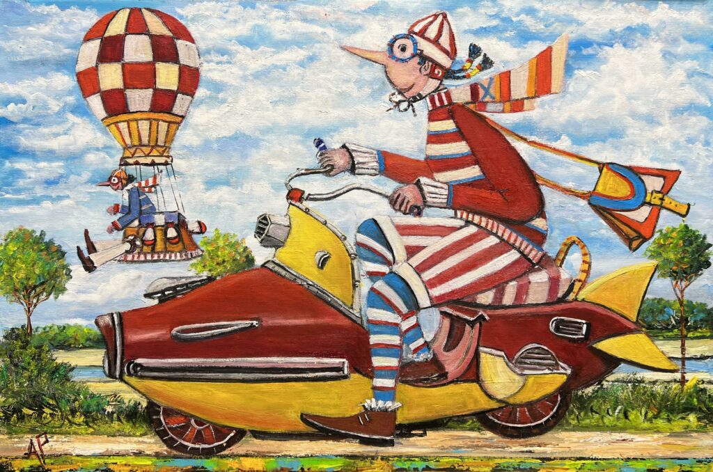 In this whimsically surreal escapade across the canvas, we are introduced to a delightfully eccentric journey. The artist presents us with a scene that mingles the quirkiness of Marc Chagall with a dash of steampunk whimsy. A character, clad in boldly striped garments, commands a fantastical flying contraption that appears to blend the charm of a vintage scooter with the soaring aspirations of a rocket. Above, a hot air balloon gracefully drifts, its passenger equally adorned in a mirthful ensemble, echoing a sense of carefree adventure.