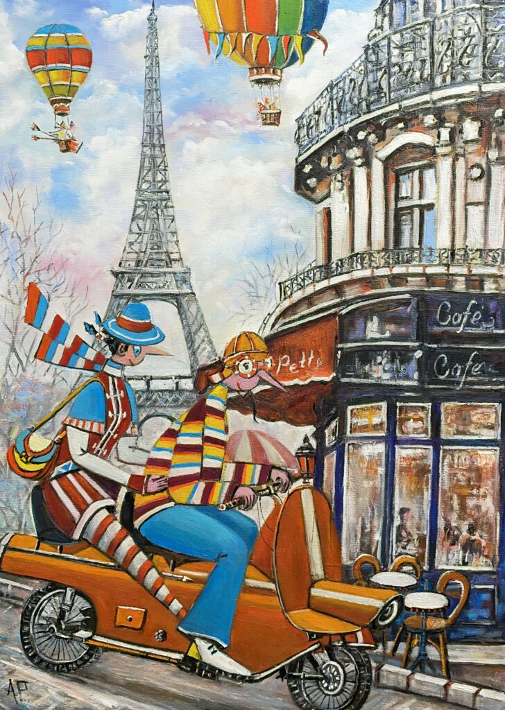 Hundreds of paintings and sculptures are in collections all over the world, including USA, New Zealand and even Afghanistan also in all European countries. Currently inspired by ceramic art in a funny way trying to tell about human passions. Behind the fairy-tale decorations are hidden the deepest human passions and desires. Canvas stretched on wooden frame. Colors of the painting may slightly differ from photos due to screen settings.