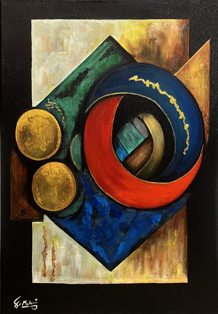 In a dazzling display of geometric bravado, this captivating composition embraces the viewer with a symphony of shapes and hues. Bold reds arc gracefully across a backdrop of deep blues and rich greens, while golden orbs punctuate the canvas like suns orbiting a mysterious cosmos. The interplay of angular and curved forms evokes a dance between order and chaos, perhaps a nod to the constructivist spirit. Layers of color subtly blend and contrast, creating a sense of depth that invites exploration. The textured strokes suggest an animated, almost tactile energy, challenging the boundaries of abstraction with both elegance and a touch of whimsy.