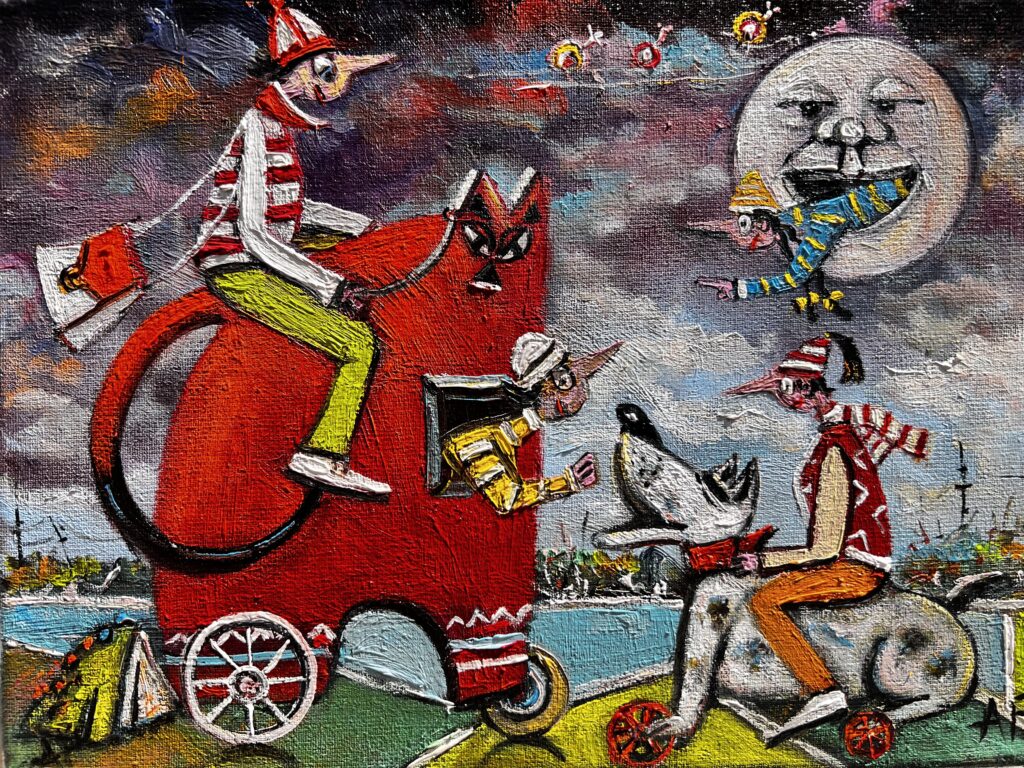Hundreds of paintings and sculptures are in collections all over the world, including USA, New Zealand and even Afghanistan also in all European countries. Currently inspired by ceramic art in a funny way trying to tell about human passions. Behind the fairy-tale decorations are hidden the deepest human passions and desires. Canvas stretched on wooden frame. Colors of the painting may slightly differ from photos due to screen settings.