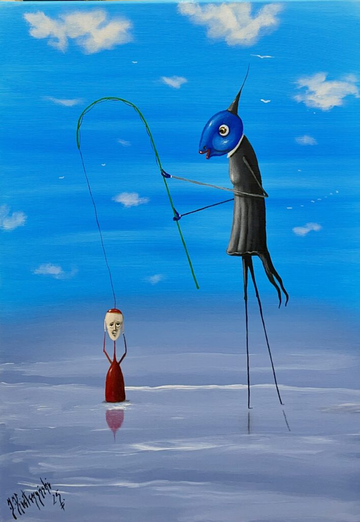 In this whimsical tableau, the artist conjures a surreal dance between figure and sky, teetering on the brink of absurdity. A tall, enigmatic figure, reminiscent of fantastical creatures from DalΓ's dreamscapes, commands the scene with elongated limbs and a vibrant, cerulean mask. Their fishing rodβa green tendril reaching towards a curious, floating visageβstretches across a serene ocean mirroring the ethereal sky, creating an uncanny illusion of reality and reflection. The palette, dominated by impassioned blues and poignant reds, enhances the dreamlike quality, inviting a playful yet contemplative mood. Here, the boundary between fantasy and existence blurs, capturing the viewer in an intricate web of profound wit and imaginative wonder.