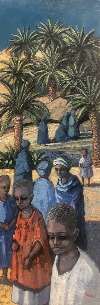 A vibrant tapestry of life unfolds in this mesmerizing canvas, where color and emotion collide under a canopy of lush palm fronds. The artist masterfully captures a scene teeming with rich cultural nuances, reminiscent of the golden hues that whisper tales of distant lands and timeless traditions. The figures, draped in flowing robes of deep blues and earthy tones, exude a serene yet poignant presence, inviting viewers to ponder the narratives etched into their visages.