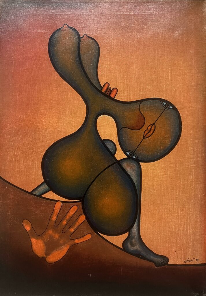 In this captivating fusion of abstraction and surrealism, the artist beckons us to venture into a realm where form and fantasy entwine with an audacious elegance. The organic curves, rendered in rich hues of burnt sienna and deep ochre, evoke the warmth of a setting sun, casting an intoxicating glow across the canvas. Bold, sinuous lines define the composition, creating a dance of fluidity and balance that teeters on the edge of the fantastical. A solitary handprint emerges, almost playfully, inviting us to ponder the underlying narrativeβperhaps a whispered gesture towards the artistβs own spirited humor. This piece stands as a testament to the power of visual imagination, marrying color and form in a symphony of visual delight.