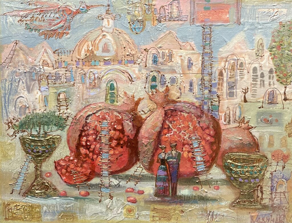 Hundreds of paintings and sculptures are in collections all over the world, including USA, New Zealand and even Afghanistan also in all European countries. Currently inspired by ceramic art in a funny way trying to tell about human passions. Behind the fairy-tale decorations are hidden the deepest human passions and desires. Canvas stretched on wooden frame. Colors of the painting may slightly differ from photos due to screen settings.