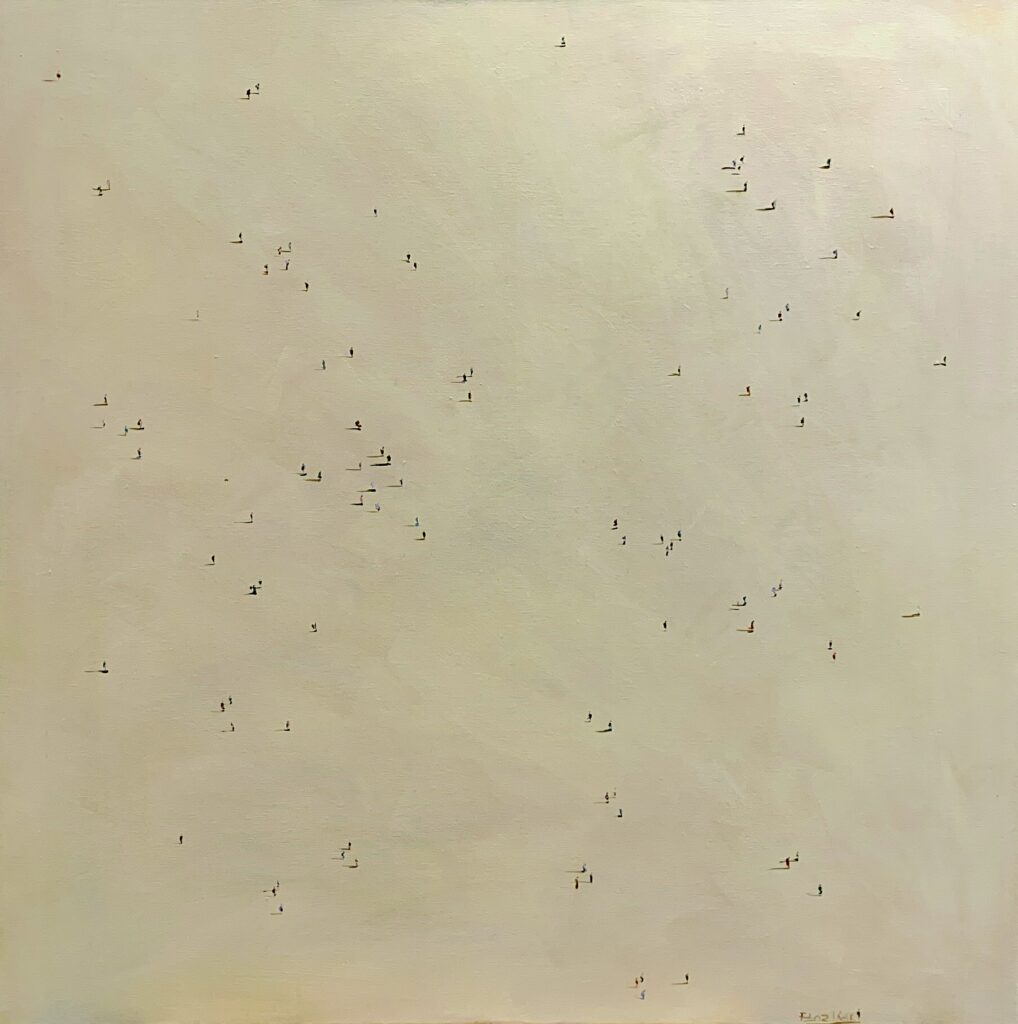 Here, human life is reduced to barely perceptible dots, each suggesting stories untold, evoking a poignant sense of isolation amidst collective existence. The canvas vibrates with an exquisite tension between emptiness and abundance, drawing us into a meditative contemplation reminiscent of Seurat's pointillism, yet with a modernist twist. In this suspended moment, the ordinary becomes extraordinary, urging us to appreciate the quiet poetry of life's simple, scattered moments.