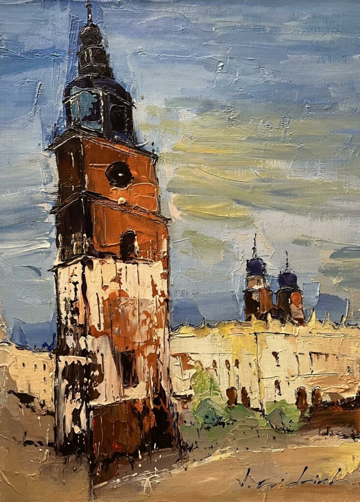 In this vibrant cityscape, the artist conjures an enigmatic dance between shadow and light, elevating the historic architecture to a near-mythical status. The bold, impasto technique imbues the canvas with a tactile richness, reminiscent of the Impressionist maestros, yet with a contemporary twist. Dominating the composition is a robust tower, its earthy tones harmonizing with the whispers of azure and pale gold in the sky, evoking a sense of timelessness. The juxtaposition of the delicate skyline in the background adds a playful contrast, an ode to urban resilience. This piece invites the viewer to revel in the beauty of fleeting moments, captured with a deft hand and a discerning eye.
