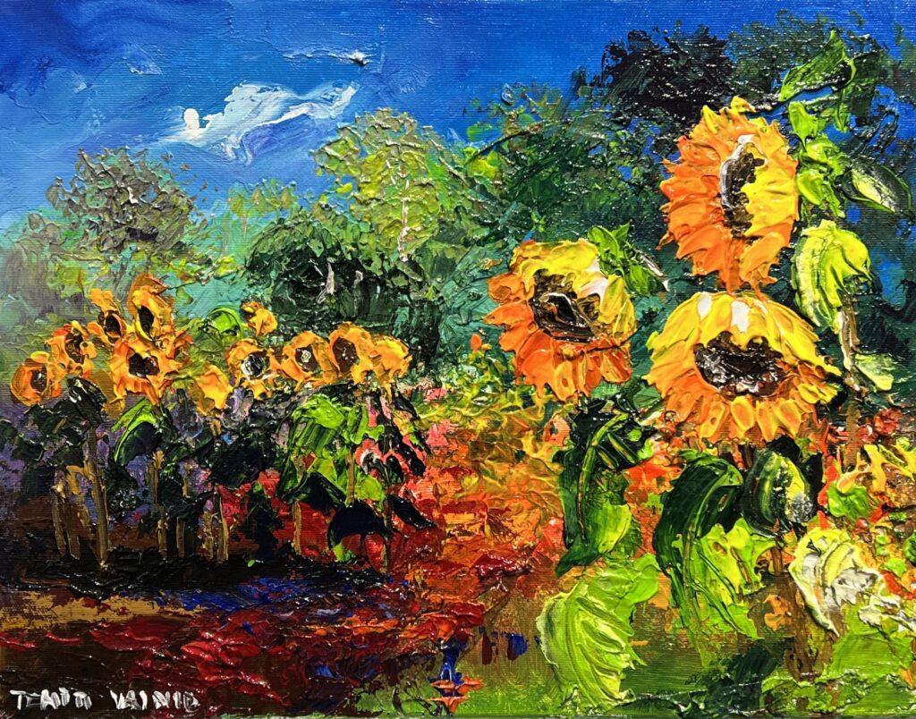 In this vibrant tableau, a cascade of sunflowers gallantly parades under a gloriously expressive blue sky, evoking the fiery spirit of Van Gogh with a fresh, modern zest. The exuberant brushstrokes dance with joyful abandon, their thickness giving the piece a palpable, tactile energy. Vivid oranges and yellows flirt harmoniously with the lush greens, creating a lush symphony of color that boldly traverses the canvas. This composition masterfully captures the joyous riot of a midsummer garden, each sunflower a radiant beacon, its face turned rebelliously against the backdrop of lush foliage. A scene so infused with life and vigor, it belies its stillness, inviting one to step closer, to inhale the scent of audacious blooms daring to reach for the sun.