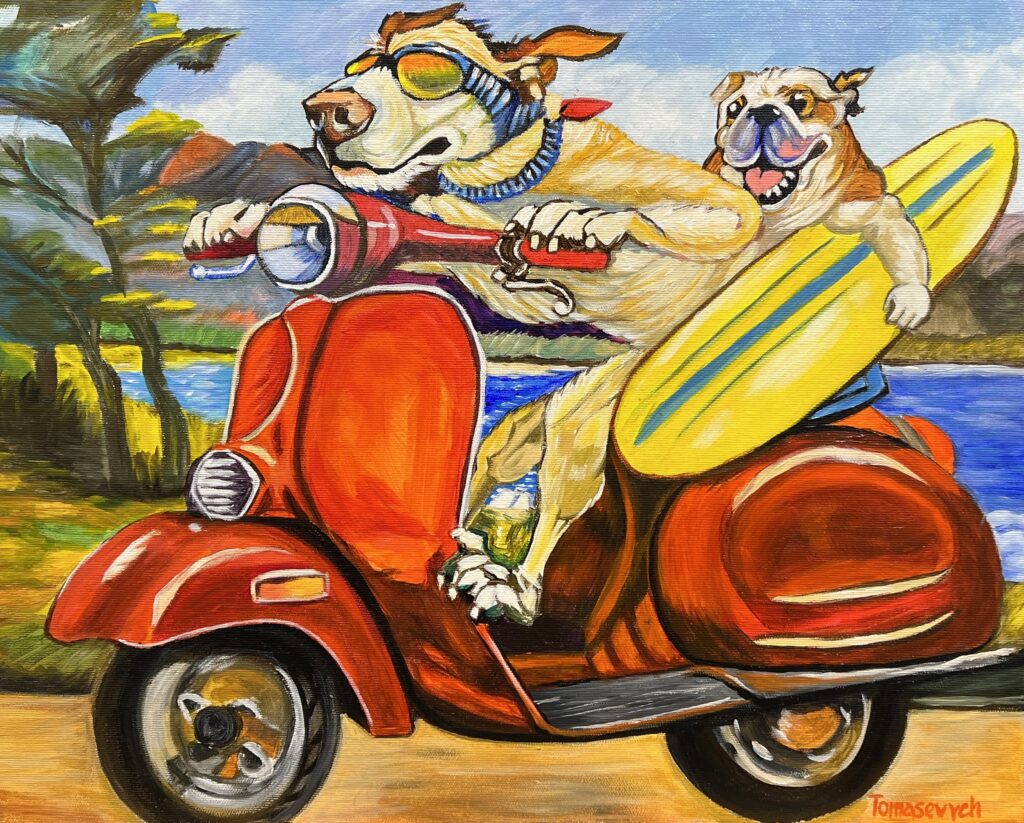 In this whimsical tableau, two canines embark on a lively escapade upon a vivid, cherry-red scooter that bursts forth from the canvas with unrestrained exuberance. The primary pooch, adorned with snug goggles, pilots their two-wheeled chariot, exuding a cool confidence reminiscent of a 1960s road movie. Meanwhile, a jubilant companion clutches a surfboard, evoking dreams of sun-drenched coastlines yet to be conquered. The scene is enveloped in a riot of colors and brisk brushstrokes, capturing the spontaneity of an impromptu adventure. The artist's playful nod to surrealism melds seamlessly with an almost Fauvist delight in exaggerated hues, offering an irresistible invitation to revel in the sheer joy of the open road.