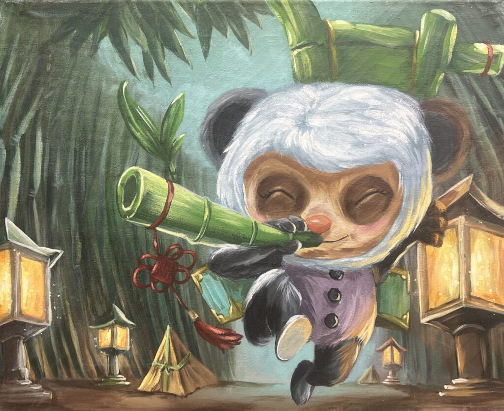 This whimsical painting features Panda Teemo, a beloved skin from League of Legends. Set in a glowing bamboo forest, Teemo joyfully explores with a scroll in hand, dressed in his signature panda outfit. Lanterns and tents add a touch of mysticism, blending Eastern aesthetics with fantasy charm. The piece captures Teemoβs playful spirit in a peaceful, enchanted setting.