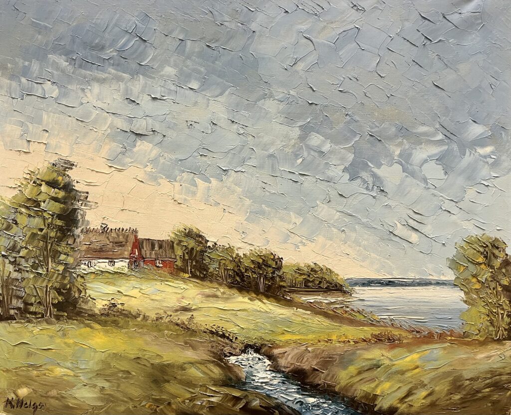 An oil painting depicting a picturesque waterside landscape, decorated in warm, natural colors. With extraordinary attention to texture, the artist uses the technique of thick strokes with a painting palette knife, giving the composition exceptional depth and a three-dimensional impression.