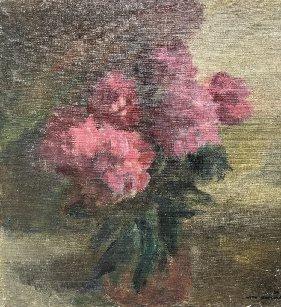 Peonies in Shadow is a subtle, moody still life in which form dissolves gently into atmosphere. Rendered in soft brushwork and restrained hues, the bouquet of dusky pink peonies appears almost to emerge from the background, blurring the line between subject and setting.