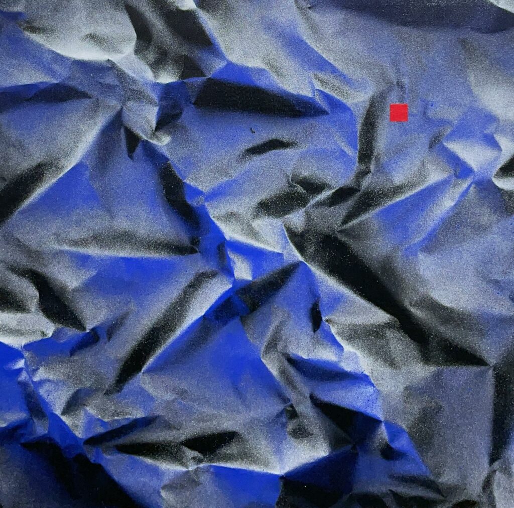 In this intriguing piece, the artist deftly employs abstract expressionism to convey a tapestry of texture and emotion. The canvas unfurls like crumpled silk, its folds masterfully captured in a tumultuous dance of deep blues and shadowy blacks. This interplay creates a sense of depth that draws the viewer into an almost cosmic reverie. The singular, bold red square punctuates the composition with a jolt of contrast, reminiscent of Kazimir Malevichβs suprematism, adding an unexpected twist to the visual narrative. The technique is both deliberate and spontaneous, inviting contemplation of order amidst chaos. This artwork is an evocative exploration of form and color that transcends simplistic categorization.