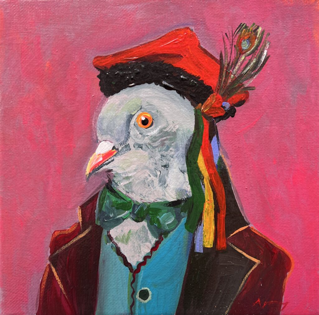 In this whimsical masterpiece, we encounter a delightful avian aristocrat, whose portrait seems to bridge the gap between the ordinary and the extraordinary. With a nod to the playful elegance of surrealism, the artist masterfully blends realism and fantasy. The pigeon, adorned in a scarlet hat and resplendent ruffs, stands proudly against a bold pink canvas, evoking the mischievous spirit of Renaissance portraiture with a modern twist. The vibrant colors, from the peacock feather flourish to the emerald bowtie, shimmer with audacity, while the intricate brushwork and controlled chaos of hues elevate the subjectβs character to avian nobility. Irresistibly charming, it invites us to ponder the curious, joyful world where pigeons parade as dukes and jesters alike.