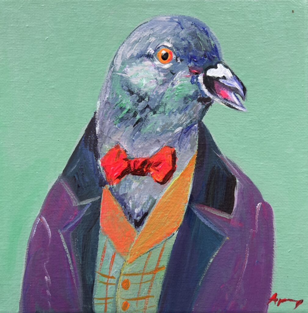 Behold the avian aristocrat, a whimsical masterpiece where a dapper pigeon dons a suit and bow tie, echoing the playful spirit of anthropomorphism. The artist paints with a bold, vibrant palette, wherein the deep plum of the coat and the fiery red of the bow tie contrast elegantly against the pigeon’s soft, bluish-grey plumage. The background, a gentle seafoam green, enhances the subject's sartorial charisma. This composition, balancing on the precipice of surrealism and pop art, teases the viewer's imagination while inviting a smile. With undeniable charm, it stands as a delightful commentary on elegance and eccentricity in the animal kingdom.
